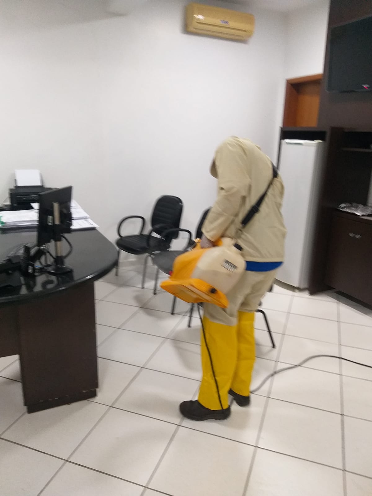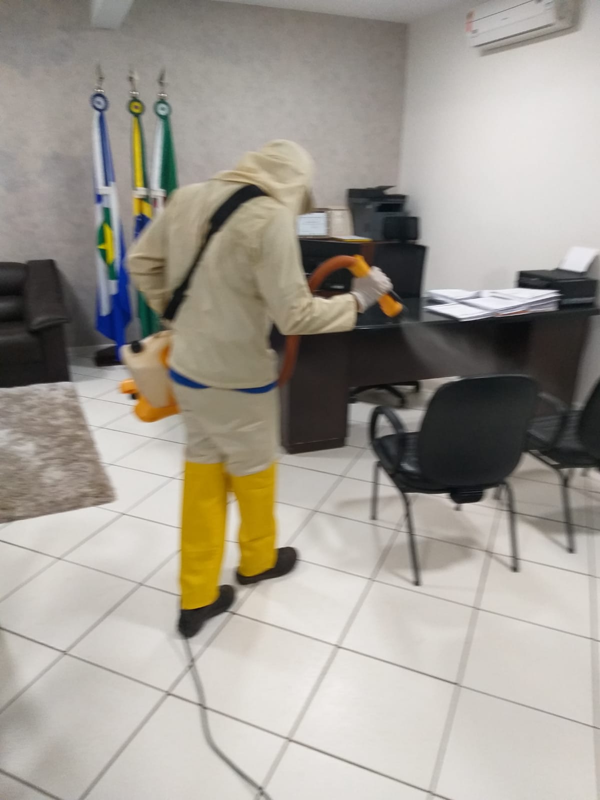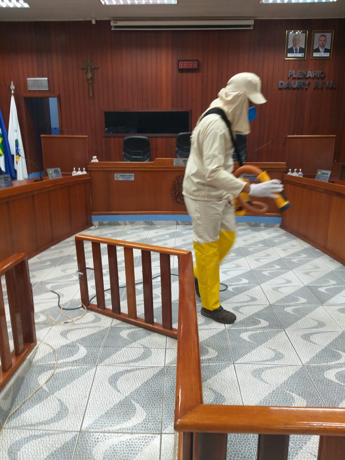O trabalho de desinfecção foi realizado no último sábado, sem a concentração de pessoas no local, facilitando a condução da ação e a aplicação dos produtos químicos de forma segura.