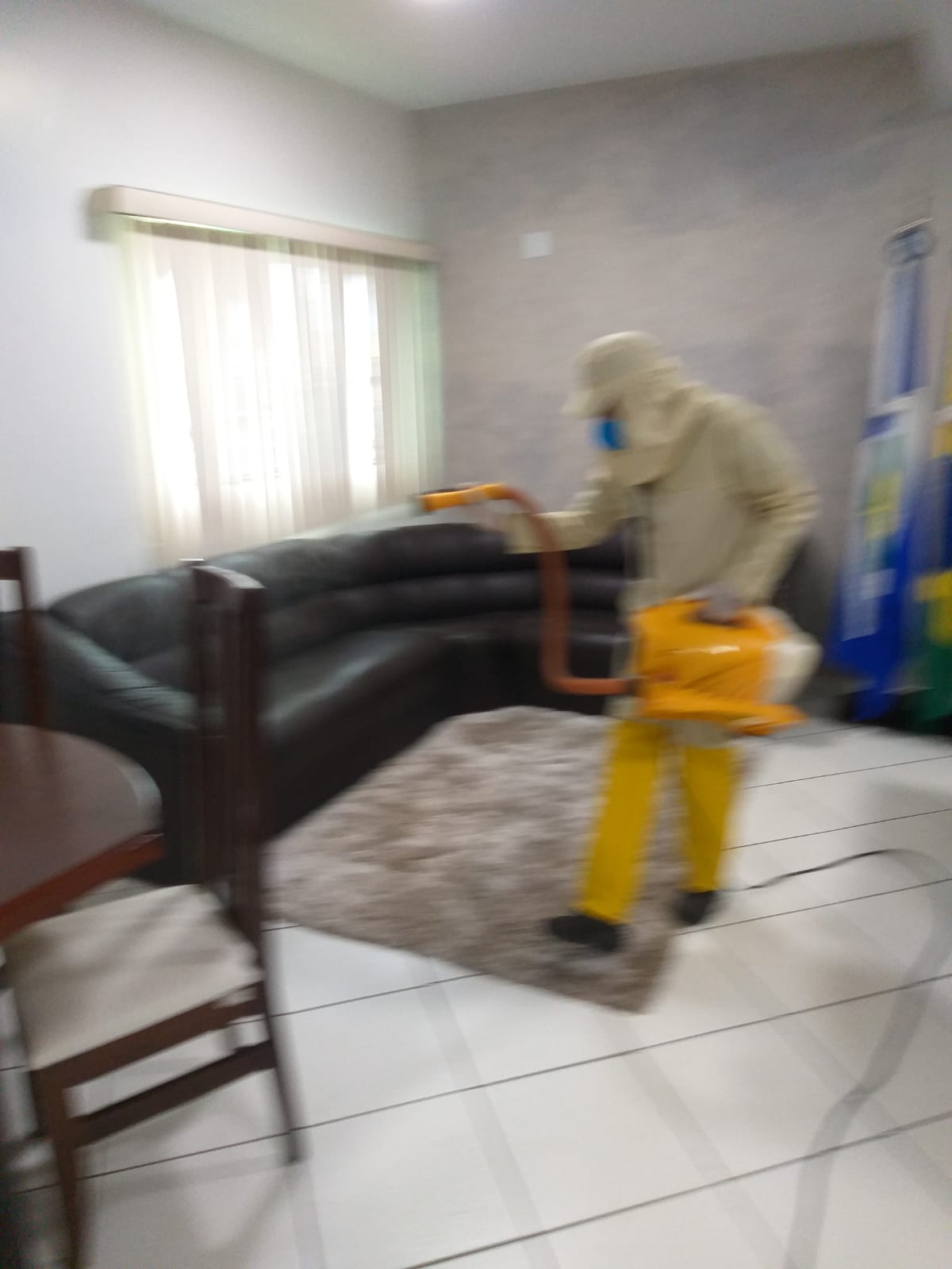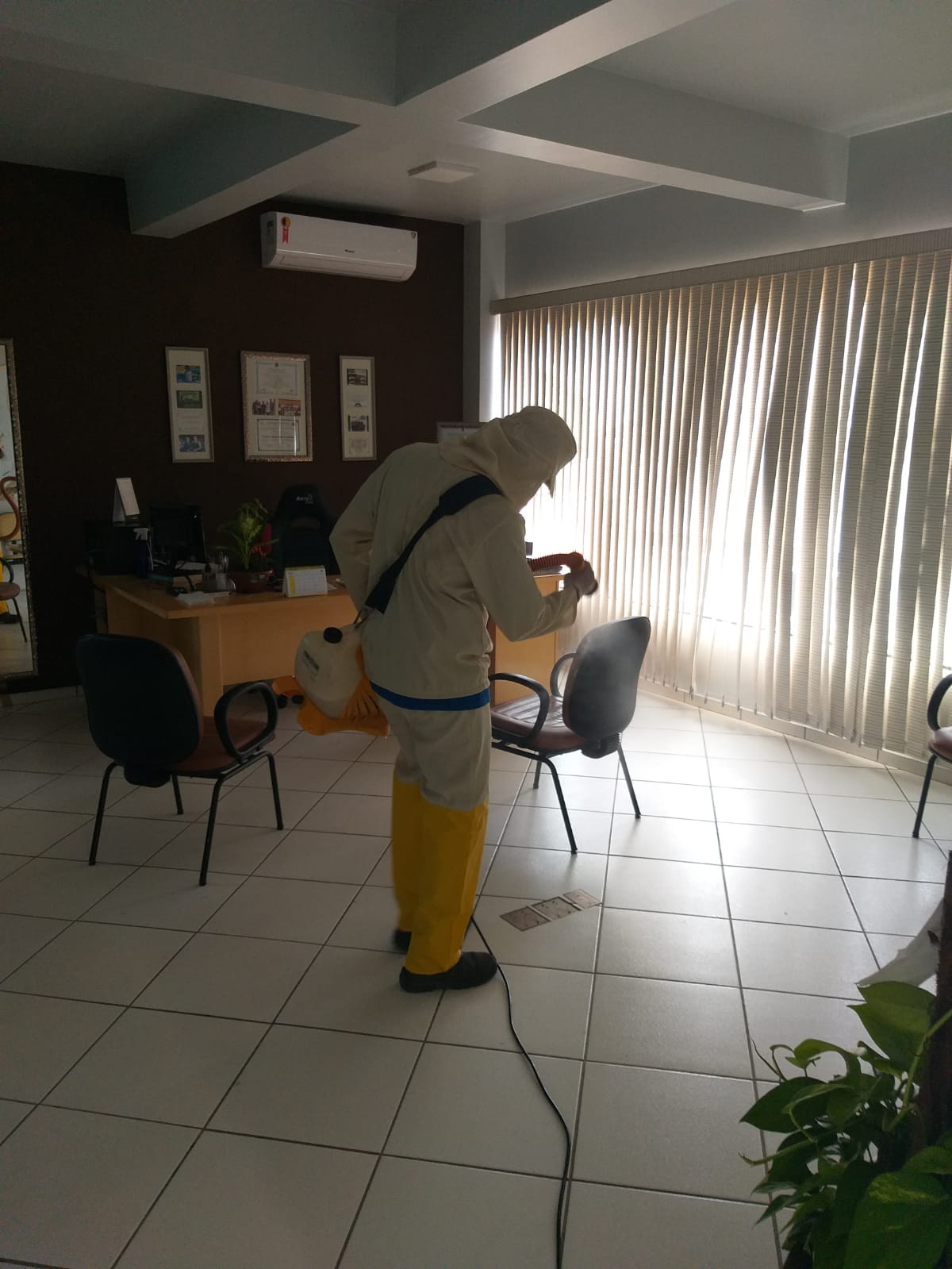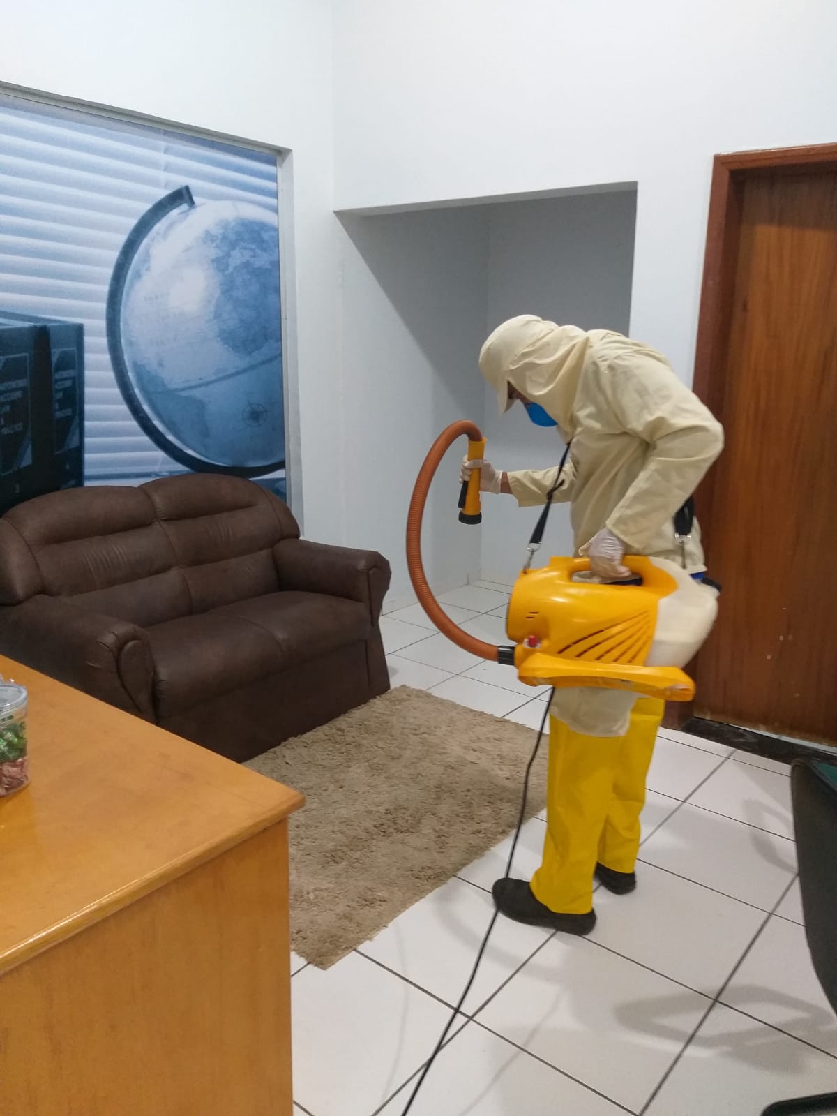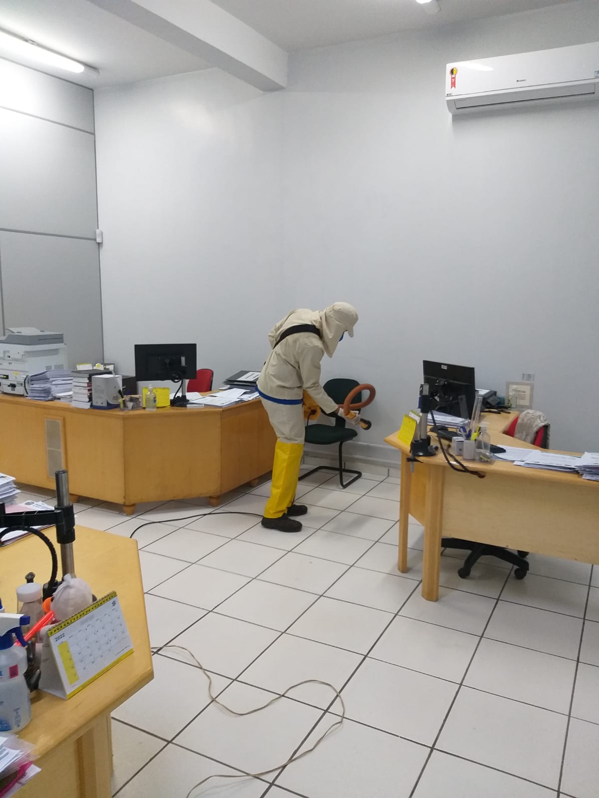 O trabalho de desinfecção foi realizado no último sábado, sem a concentração de pessoas no local, facilitando a condução da ação e a aplicação dos produtos químicos de forma segura.