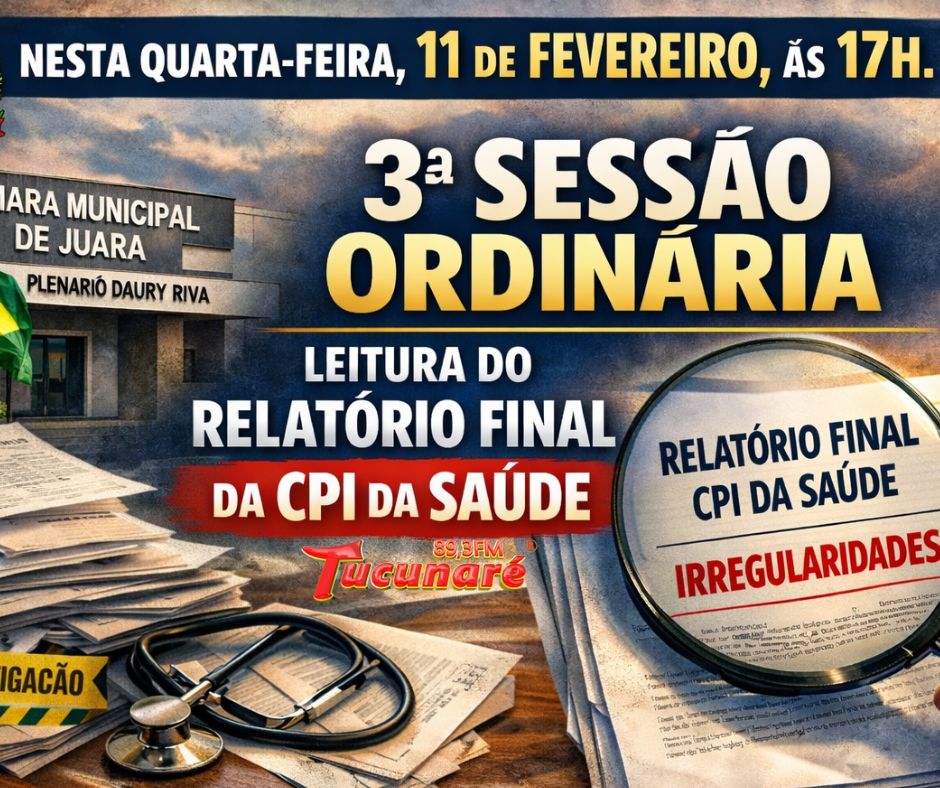 A Câmara Municipal de Juara realiza nesta quarta-feira, às 17 horas, no Plenário Daury Riva, a leitura do relatório conclusivo da Comissão Parlamentar de Inquérito da Saúde. O documento será apresentado oficialmente à população em sessão pública, com portas abertas, e também poderá ser acompanhado ao vivo pelo canal da Câmara no YouTube, com retransmissão pelo Facebook da Rádio Tucunaré.