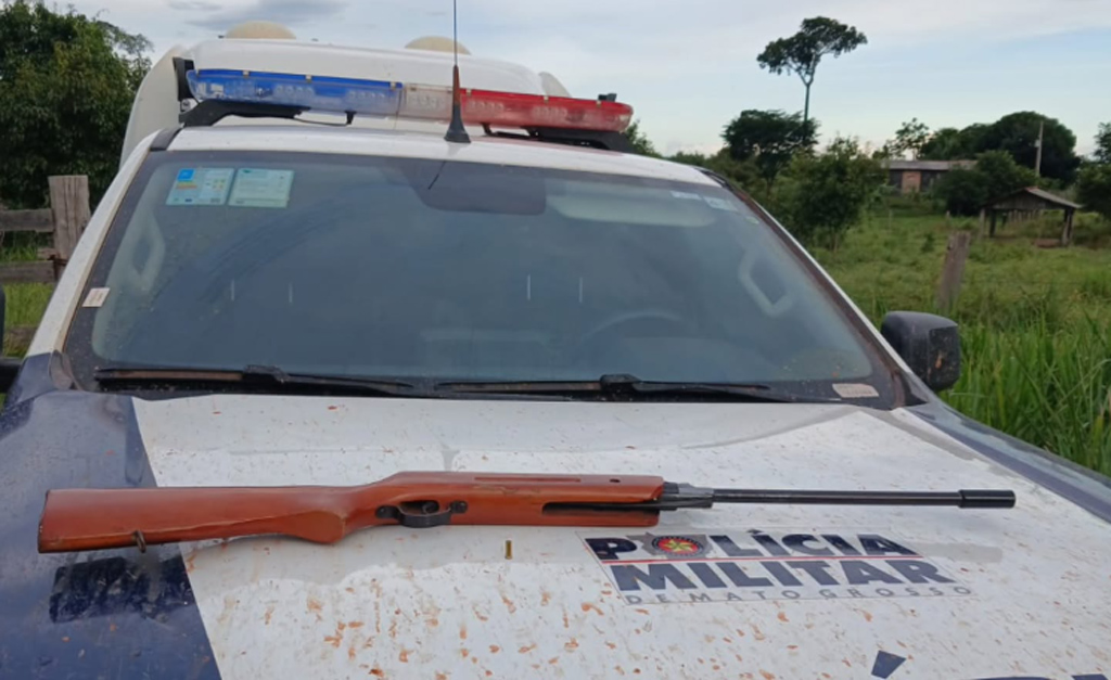 Durante a ocorrência, os policiais se deslocaram até a residência e localizaram um rifle de pressão calibre 5,5 mm adaptado para disparar munição calibre .22, além de uma cápsula deflagrada.