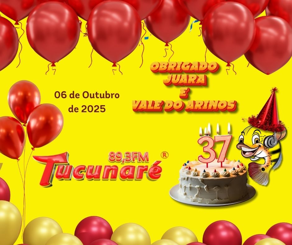 Juara (MT), 06 de outubro de 2025 – Hoje é dia de festa para Juara e todo o Vale do Arinos! A Rádio Tucunaré 89,3 FM completa 37 anos de história, marcada por credibilidade, pioneirismo e um compromisso inabalável com a informação de qualidade e o desenvolvimento regional. E neste aniversário especial, a emissora faz questão de agradecer — aos ouvintes fiéis, aos mais de 300 anunciantes, à equipe dedicada e a toda a população que construiu junto essa trajetória de sucesso. A reportagem da Rádio Tucunaré e site Acesse Notícias apurou.