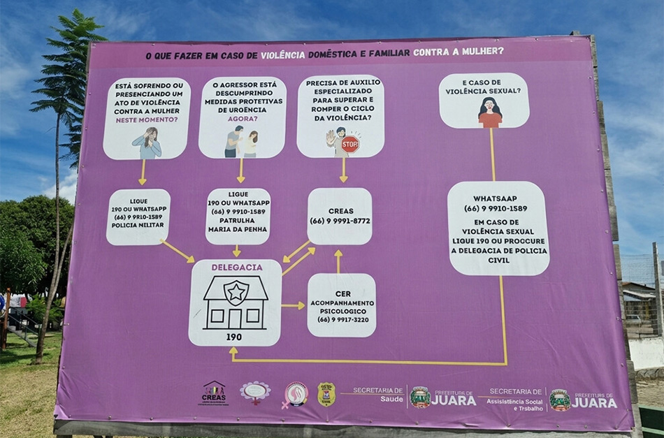 Para orientar a população e salvar vidas, a Prefeitura de Juara, por meio da Secretaria de Assistência Social e do CREAS, instalou à alguns dias uma placa informativa na Praça dos Colonizadores, com um passo a passo claro sobre como agir em casos de violência contra a mulher.